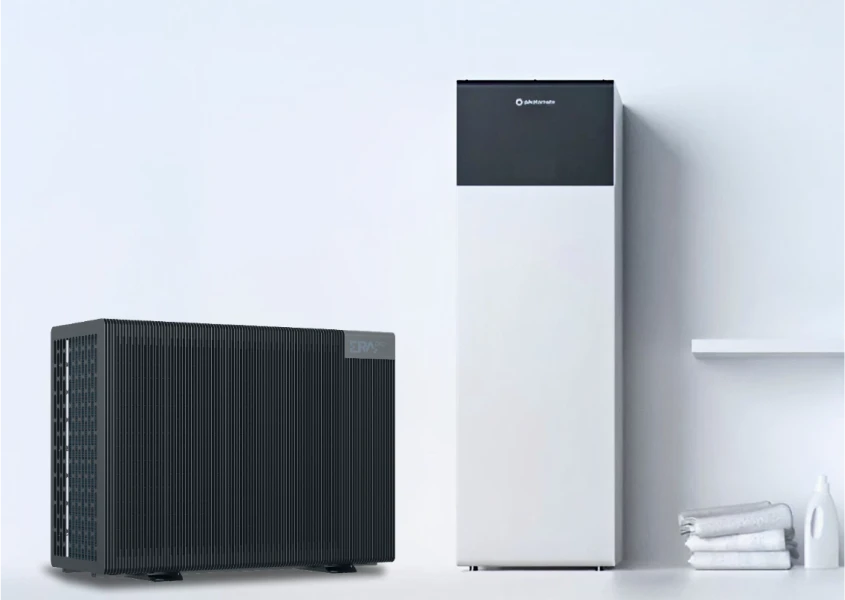 Sestava tepelného čerpadla ERA PRO a vnitřní jednotky DHWU 9, s vestavěnnou TUV nádrží. Je optimální varianta pro novostavby rodinných domu tak i rekonstrukcí, zejména s důrazem na malý instalační prostor a úsporu místa.